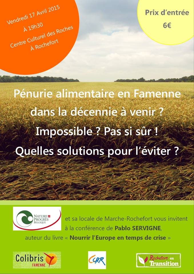 - la conférence de Pablo Servigne vendredi 17 avril au Centre culturel de Rochefort, sur le thème « Nourrir l’Europe en temps de crise »